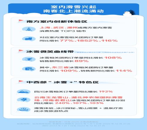 報告顯示,室內滑雪興起,南客北上潮流持續湧動。上海、武漢、湖州成南方室內滑雪消費熱度TOP3城市,對應室內滑雪相關團購訂單量分別同比增長77%、1852%、116%。東三省、京津冀、內蒙古和新疆形成的北方“微笑曲線”冰雪產業帶團購訂單量同比增長108%,從“爾濱”出圈後的“南客北上”潮流,持續激發北方冰雪經濟活力。陝西、湖北、河南和四川為主的中西部“冰雪+”特色區也有較高熱度。例如,四川冰雪相關團購訂單量同比增長192%,雲南玉龍雪山相關團購訂單量同比增長超240%。