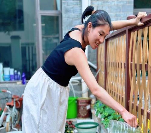 “種菜挺好玩,很有成就感”,焦安靜在菜園裏花了很多時間。隻要在家,她一早給菜澆澆水,看看長勢;中午做力量訓練,也會在菜園進行。女兒恬恬從幼兒園放學,他們會一起摘菜。焦安靜的日常還會陪女兒去公園跑步,在小區活動一下以及直播帶貨。