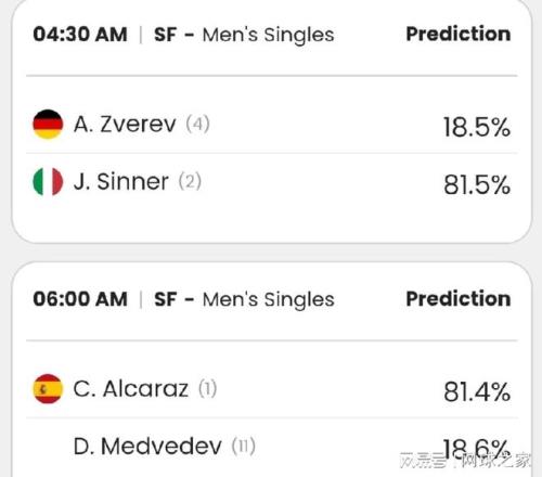 辛納的81.5%和小茲維列夫的18.5%獲勝概率,以及阿爾卡拉斯的81.4%和梅德韋傑夫的18.6%支持率,這種絕對的碾壓程度,都給人一種無比紮心的感覺。
